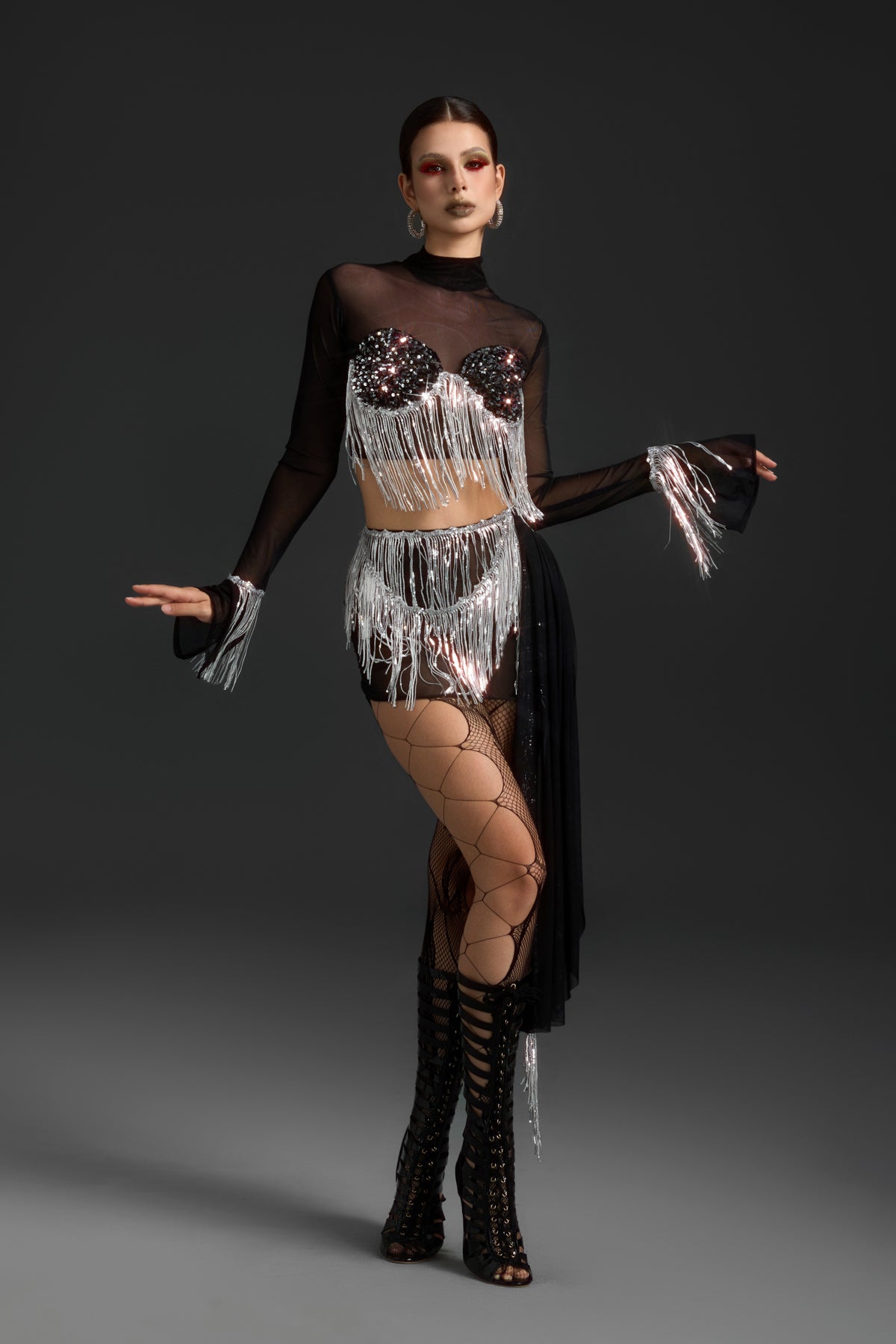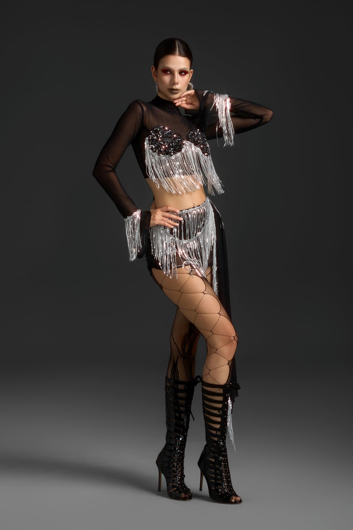The Freja Mesh Fringe Rhinestone Skirt Set combines movement and glamour in one bold ensemble. Featuring a sheer mesh skirt adorned with cascading fringe and rhinestone embellishments, this set adds rhythm and radiance to every performance. The delicate rhinestones shimmer under the lights, while the flowing fringe enhances the body’s natural motion. Ideal for stage performances, dance shows, or statement fashion moments, this set blends dramatic elegance with high-energy style.