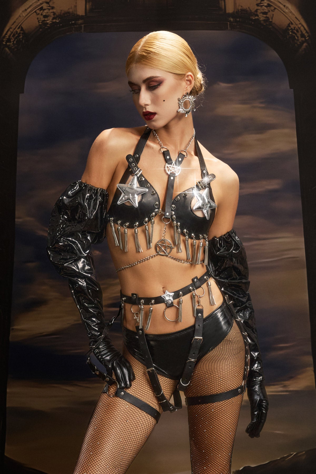 Unleash confidence and create a stunning look for the most daring performers with the Lisa Leather Bikini Five Piece Set. This stunning set includes a leather bikini top, bottoms, gloves, sleeves and leg chains - all made from shiny faux leather and embellished with hardware. Each piece is adjustable to shape your body and allow for freedom of movement, while exuding a raw, edgy energy. Whether you're on stage, at a festival or at a photo shoot, this five-piece set delivers high-impact style from every angle. It's more than just a look, it's a full-body performance tool.