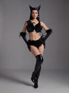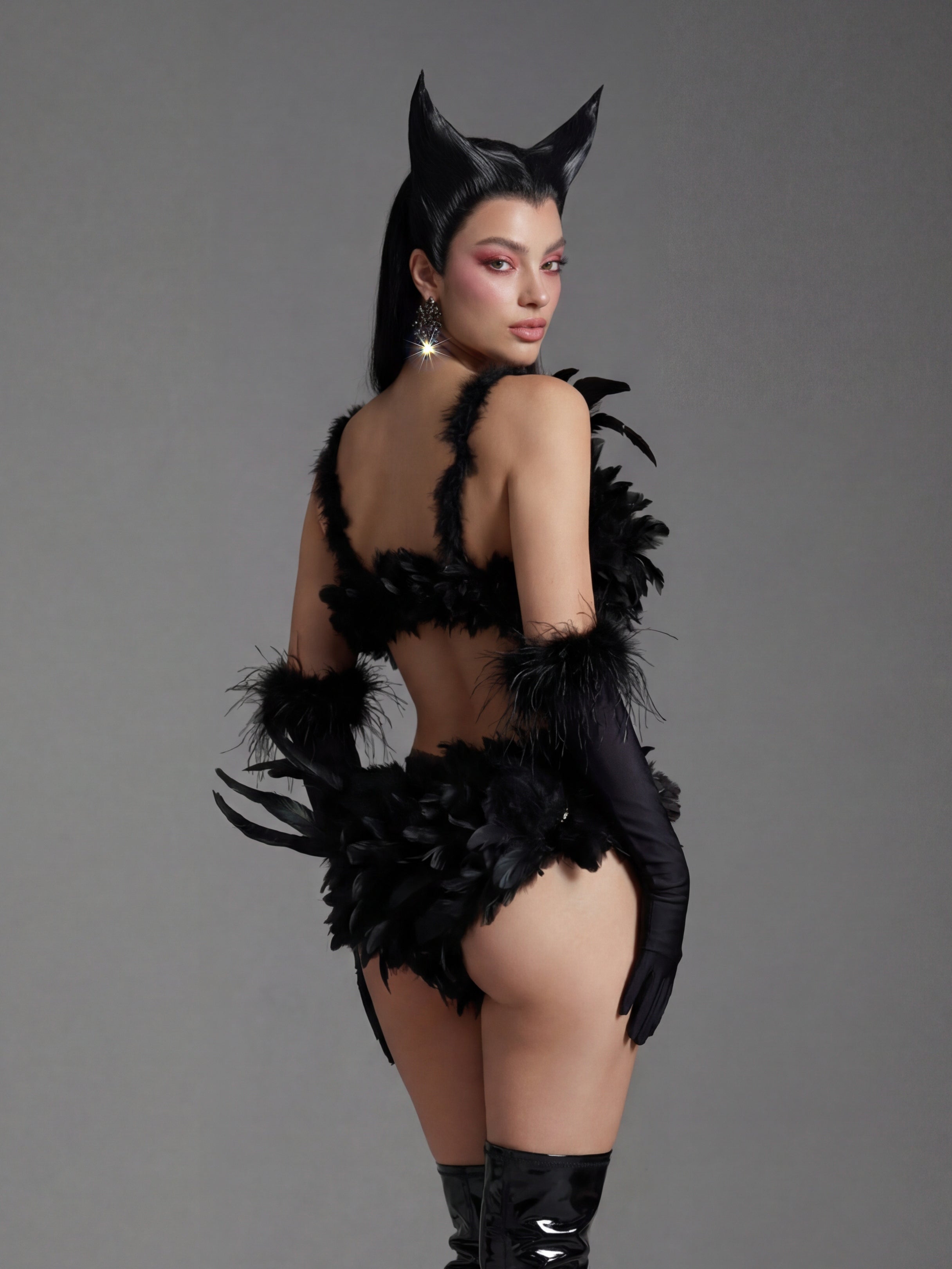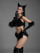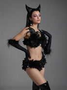 The Nyldra Feather Bikini Two Piece Set delivers a high-impact stage presence through its feather-trimmed detailing, sculpted bikini cut, and sharply defined two-piece structure that balances sensual exposure with controlled performance clarity. Feather accents add dynamic texture and airborne motion, catching light and amplifying movement with every step, turn, and pause. The fitted bikini top frames the upper body with confident lift and clean tension, while the matching bottom defines the waist and hips for a sleek, performance-ready silhouette. Together, the two-piece composition enhances body articulation and visual rhythm, ensuring bold readability and fluid energy under intense lighting conditions.