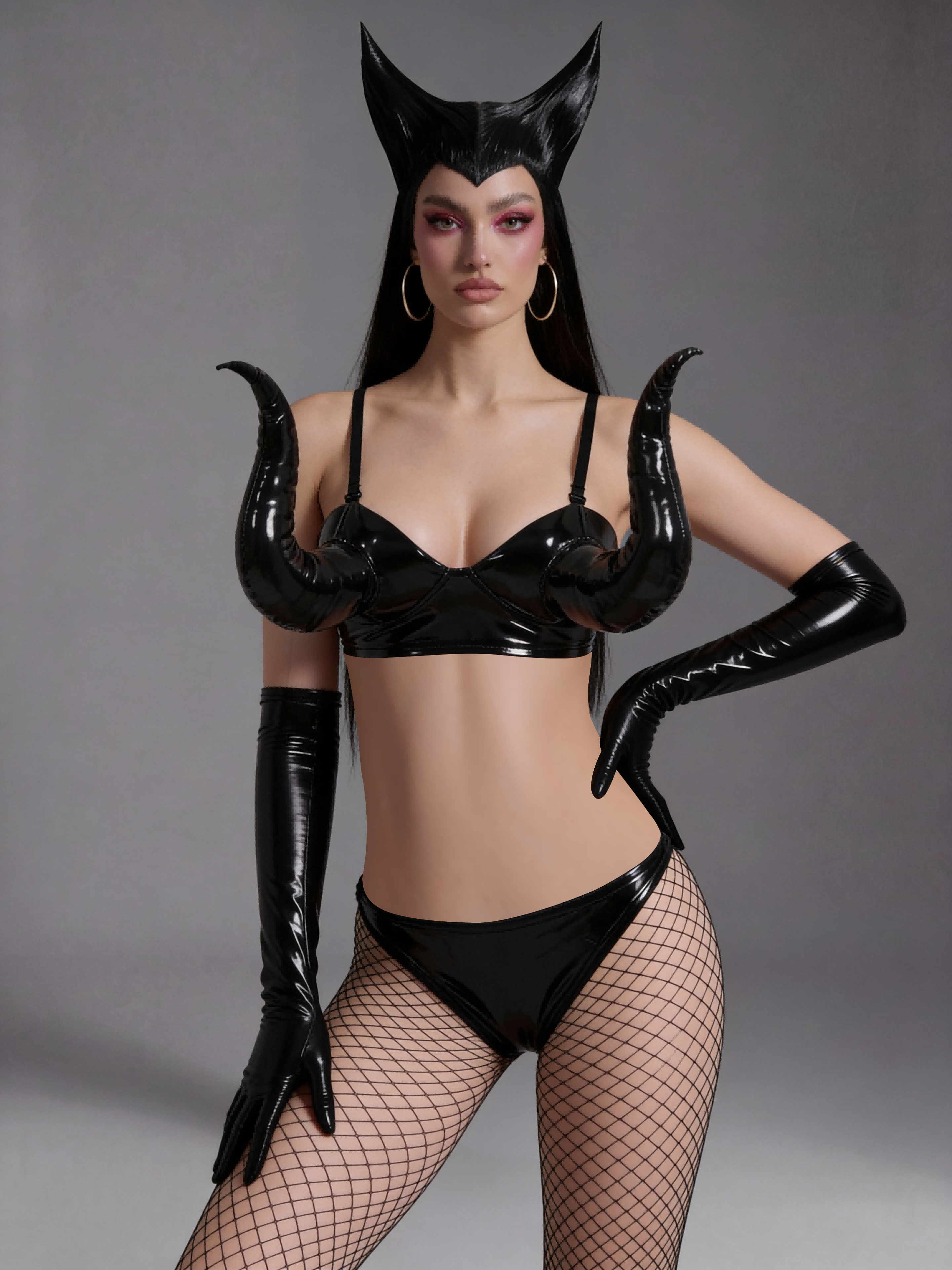 The Nysrae Crystal Shroud Patent Black Outfit delivers a striking, high-contrast stage identity through its patent-black finish, crystal-encrusted mask, and tightly coordinated four-piece composition that balances concealment, shine, and control. The full crystal mask acts as the visual epicenter, refracting light with dense brilliance while obscuring facial detail to create an aura of mystery and power. The patent-black bikini forms a sleek, sculpted core that anchors the silhouette with reflective intensity, ensuring clean contour definition under spotlights. Matching gloves extend arm lines with polished precision, enhancing gesture clarity and reinforcing the outfit’s high-gloss language. The mesh stockings introduce subtle transparency across the legs, adding layered depth and smooth tonal contrast that activates naturally with movement.