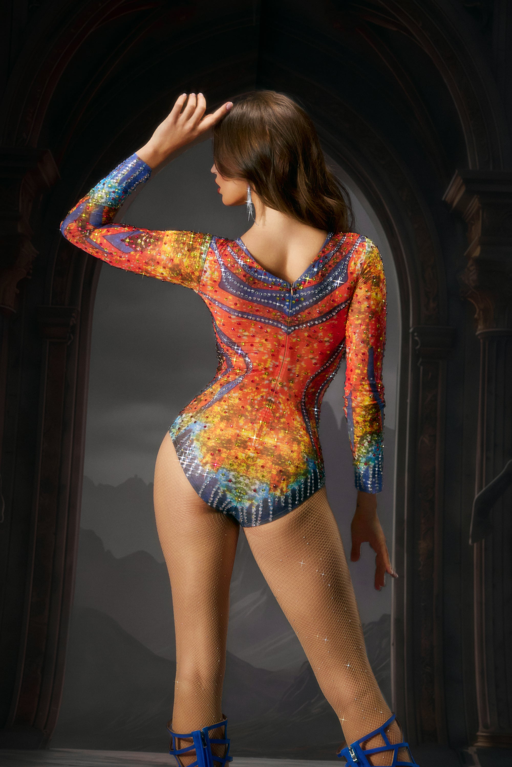 Aivis Long Sleeve Printed Rhinestone Bodysuit