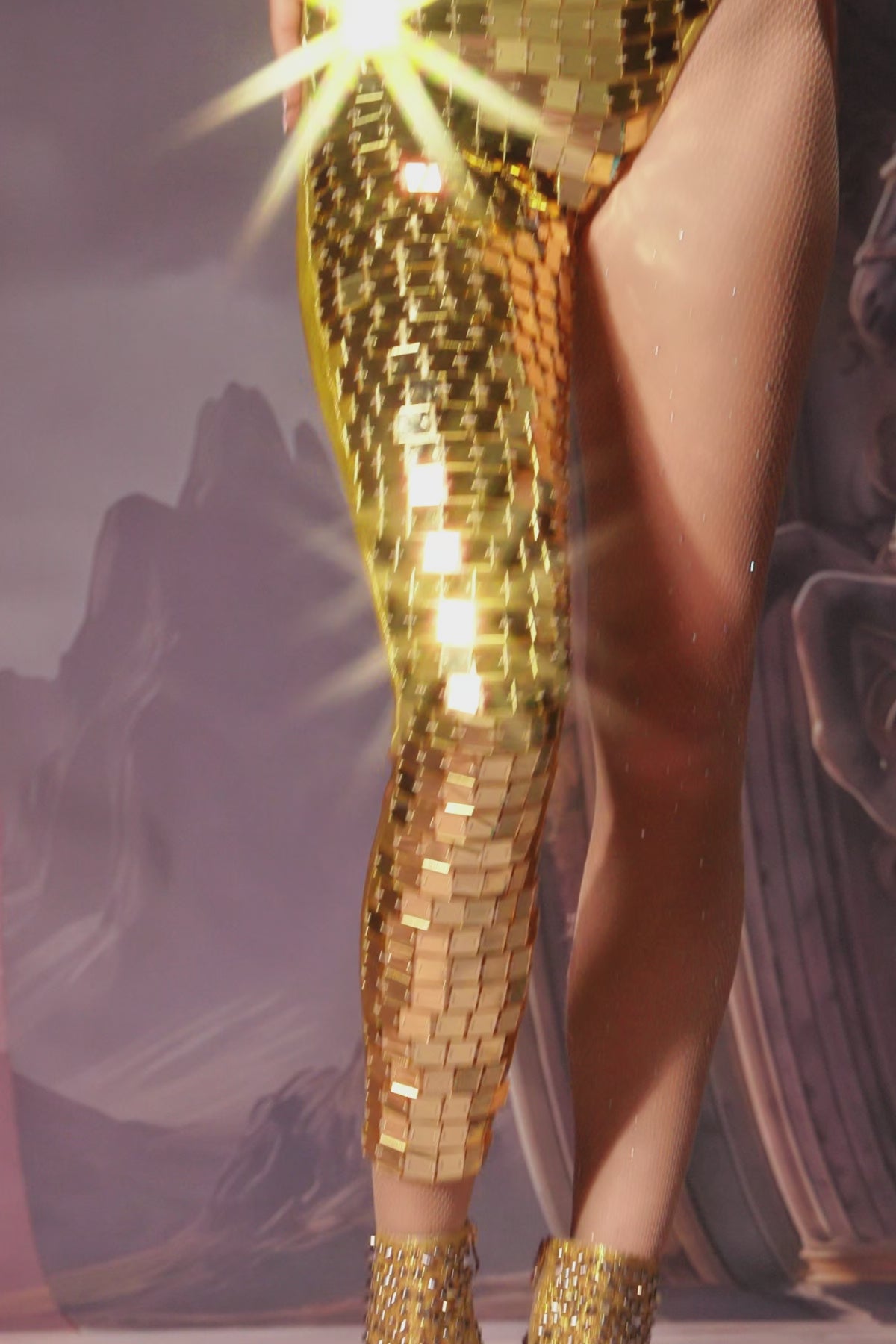 The Alvri Mirror One Shoulder Jumpsuit delivers a striking, high-clarity stage silhouette through its asymmetric one-shoulder construction, mirror-style reflective detailing, and a coordinated glove element designed to extend visual control. Mirror accents capture and reflect stage lighting in sharp flashes, intensifying movement and presence, while the single-shoulder cut creates bold upper-body contrast and directional focus. The included glove extends arm lines and enhances gesture articulation, ensuring hand movements register with greater clarity under spotlight conditions. The fitted jumpsuit structure maintains stability and precision during turns, steps, and high-energy choreography, allowing the full look to read as a unified, performance-ready statement from head to toe.