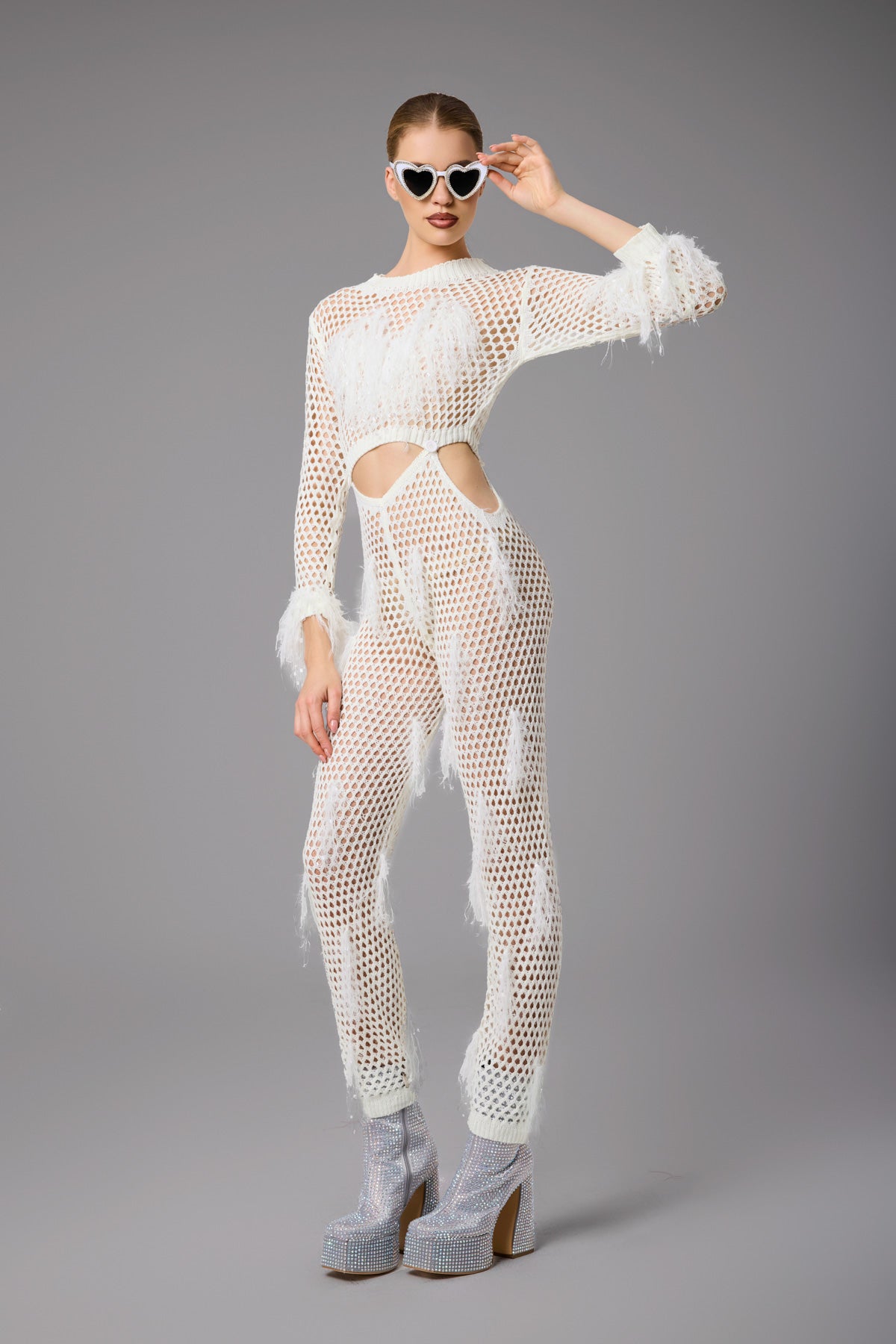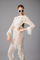 - Two-Piece Knit Design: Includes matching cutout top and fringe pants for a cohesive statement.
