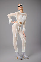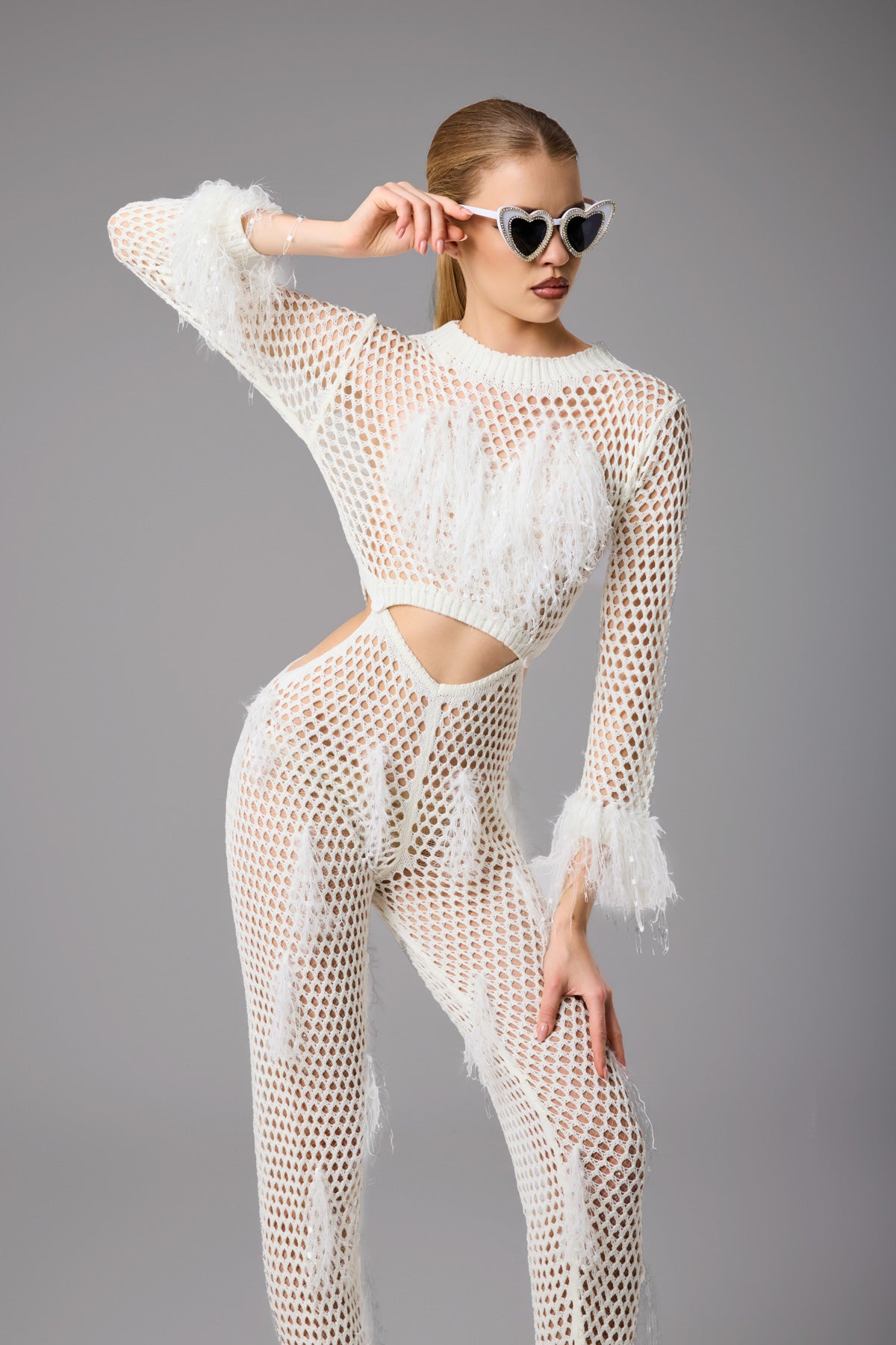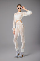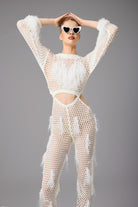 The Crue Cutout Knit Fringe Pants Set merges avant-garde texture with effortless movement. Designed with a form-fitting knit silhouette, strategic cutouts, and cascading fringe, it captures the perfect balance between bold sensuality and artistic rhythm. The coordinated top and pants create a unified, sculptural look that flows with every step—ideal for stage, dance, or elevated fashion moments.