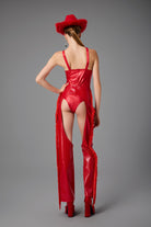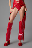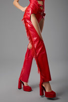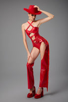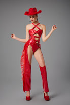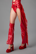 The Dax Cutout Fringe Pants capture bold energy and fluid movement. Designed with strategic cutouts and cascading fringe, they create a rhythmic flow that amplifies every step. The vivid red hue adds passion and intensity, while the sculpted fit enhances the body’s natural lines. Perfect for stage wear, performance styling, or statement fashion, these pants blend fire and freedom in motion.