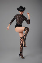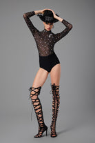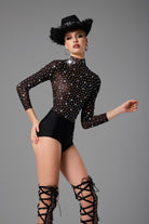 The Kyaire Long Sleeve Mesh Rhinestone Bodysuit brings a balance of elegance and edge. Designed in sheer black mesh and adorned with precision-placed rhinestones, it creates a radiant contour that moves effortlessly with the body. The sleek silhouette enhances every curve while maintaining a polished, high-impact aesthetic. Perfect for stage performances, nightlife, or statement styling, this bodysuit defines modern glamour through light and form.