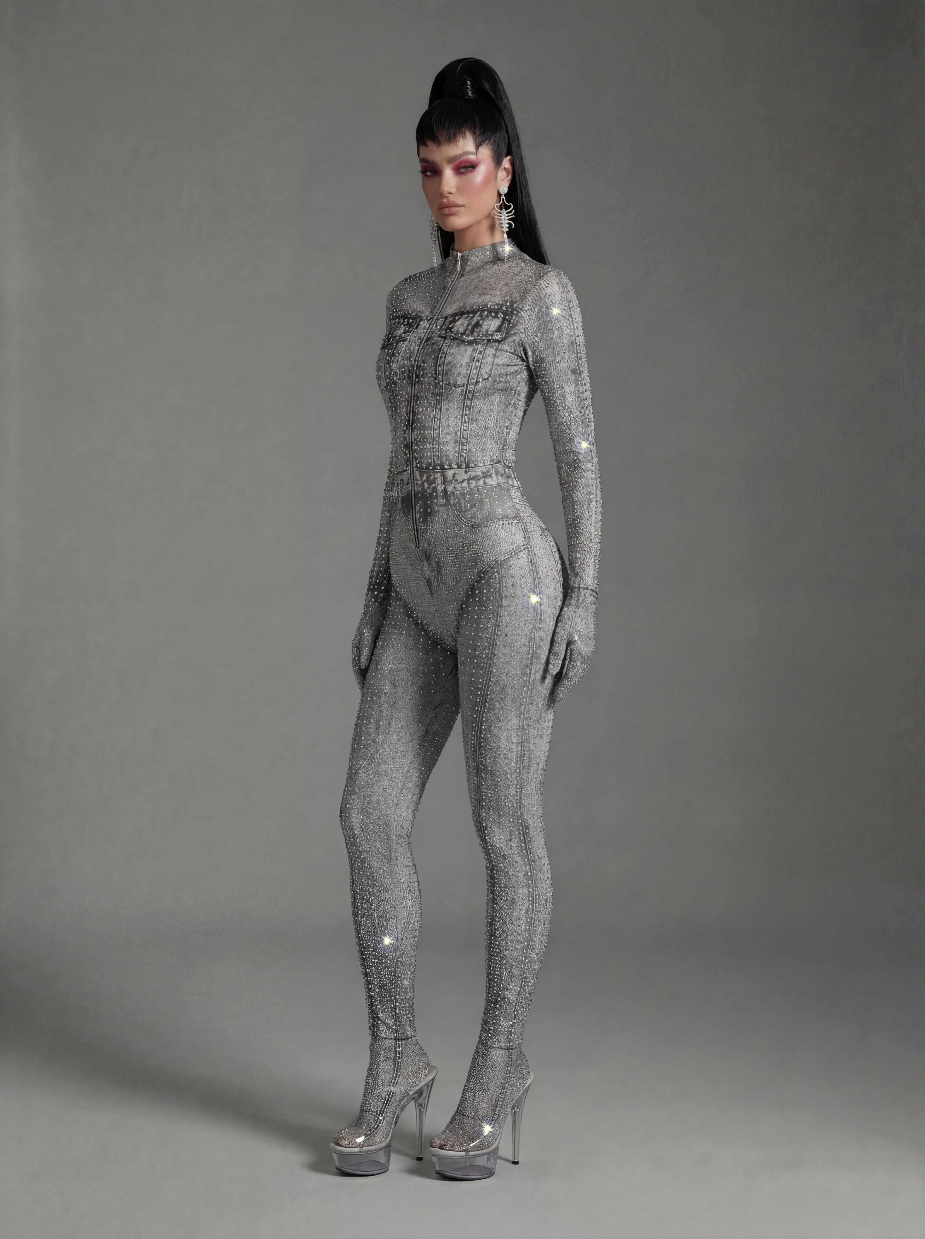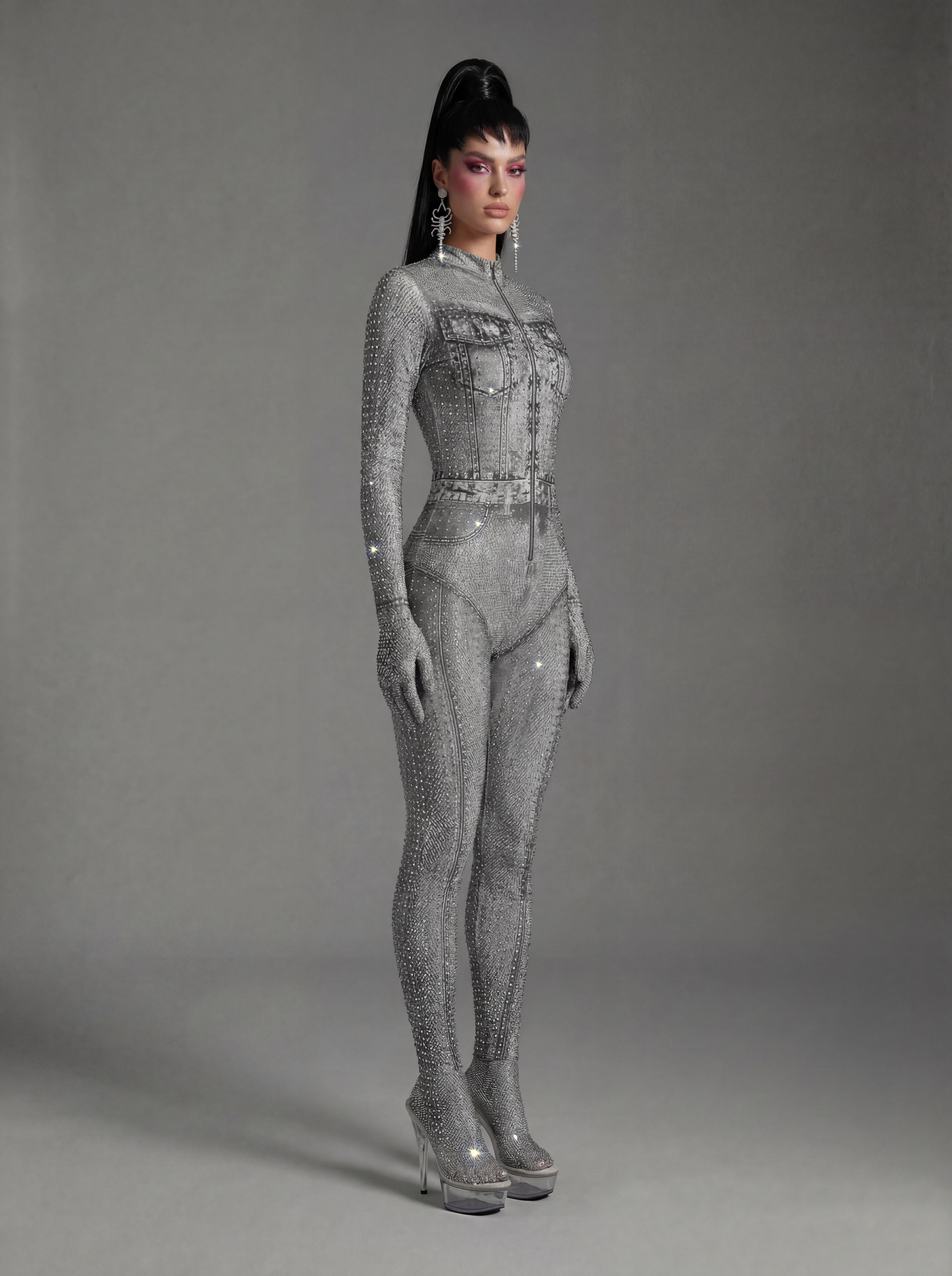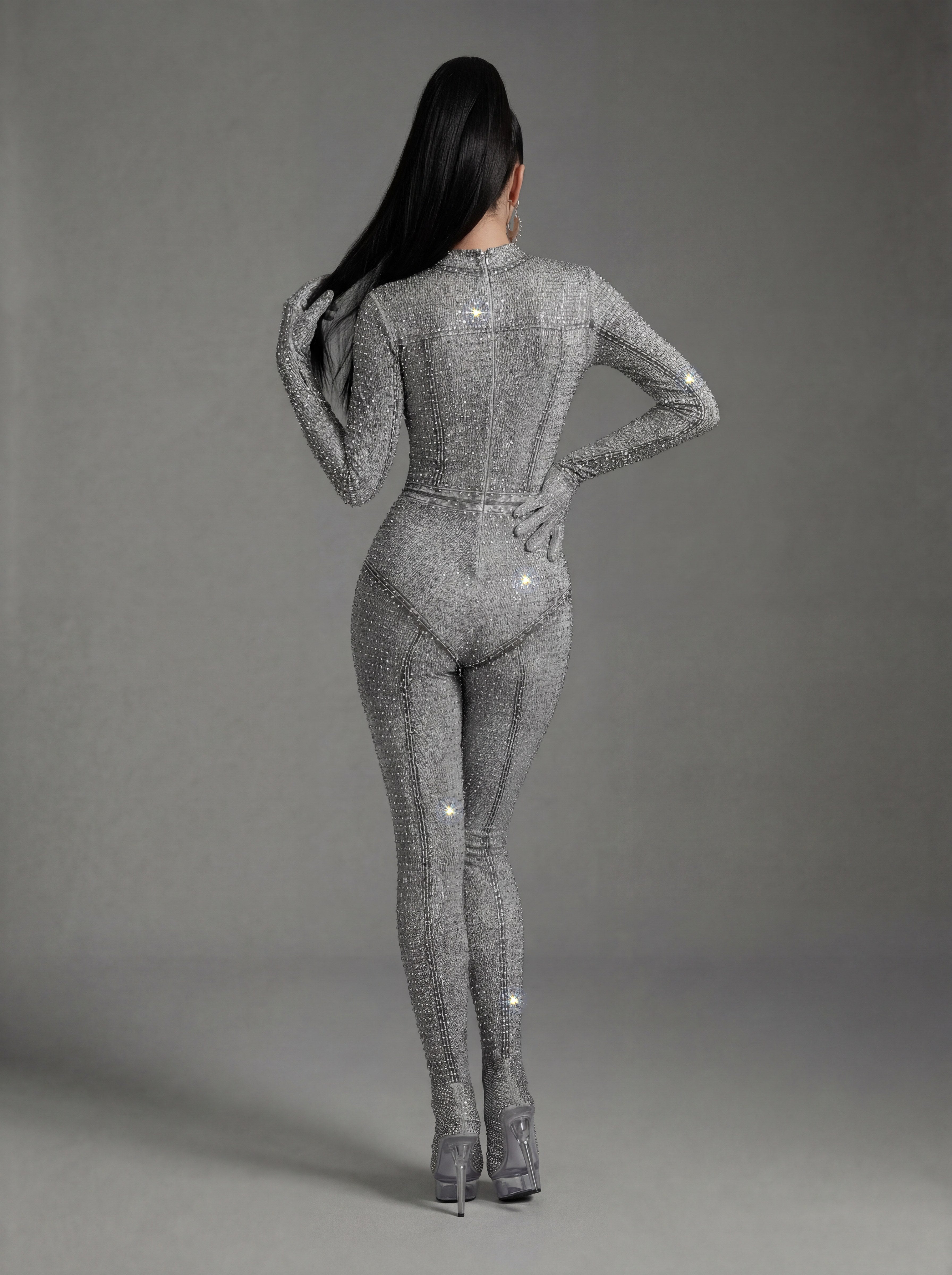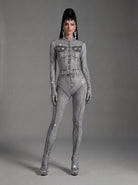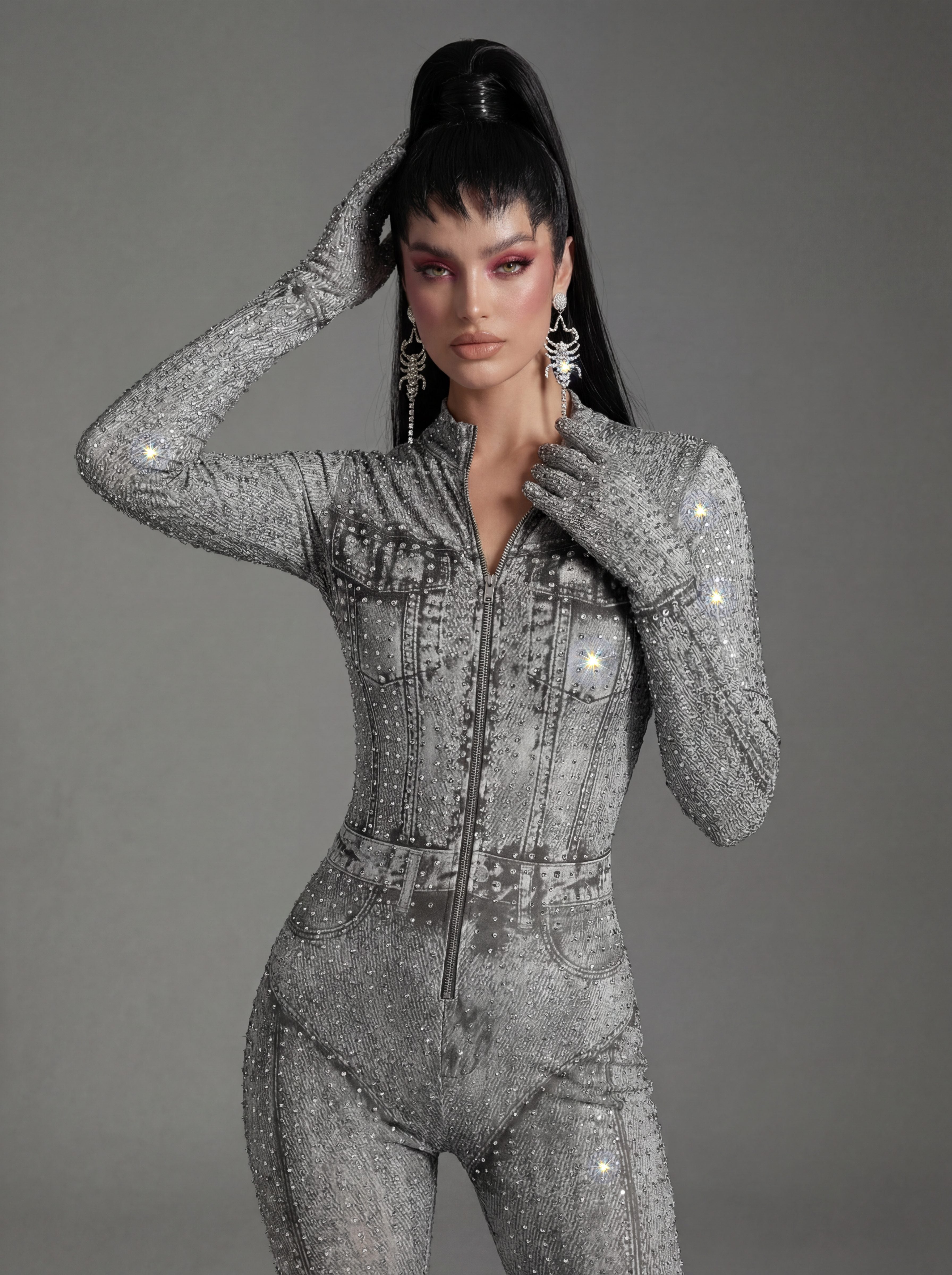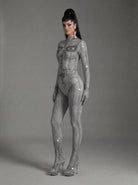 Inspired by Beyoncé’s commanding stage presence and fearless visual language, the Sældris Printed Rhinestone Long Sleeve Jumpsuit delivers a commanding, stage-focused silhouette through its bold printed surface, precision-set rhinestone accents, and sculpted long-sleeve construction designed for high-visibility performance. The graphic print creates strong surface rhythm and visual contrast, while rhinestones intensify light response with crisp sparkle under spotlight conditions. Long sleeves extend and define arm lines, enhancing expressive movement, and the fitted one-piece form creates a clean, uninterrupted body line that maintains clarity and control from every angle.