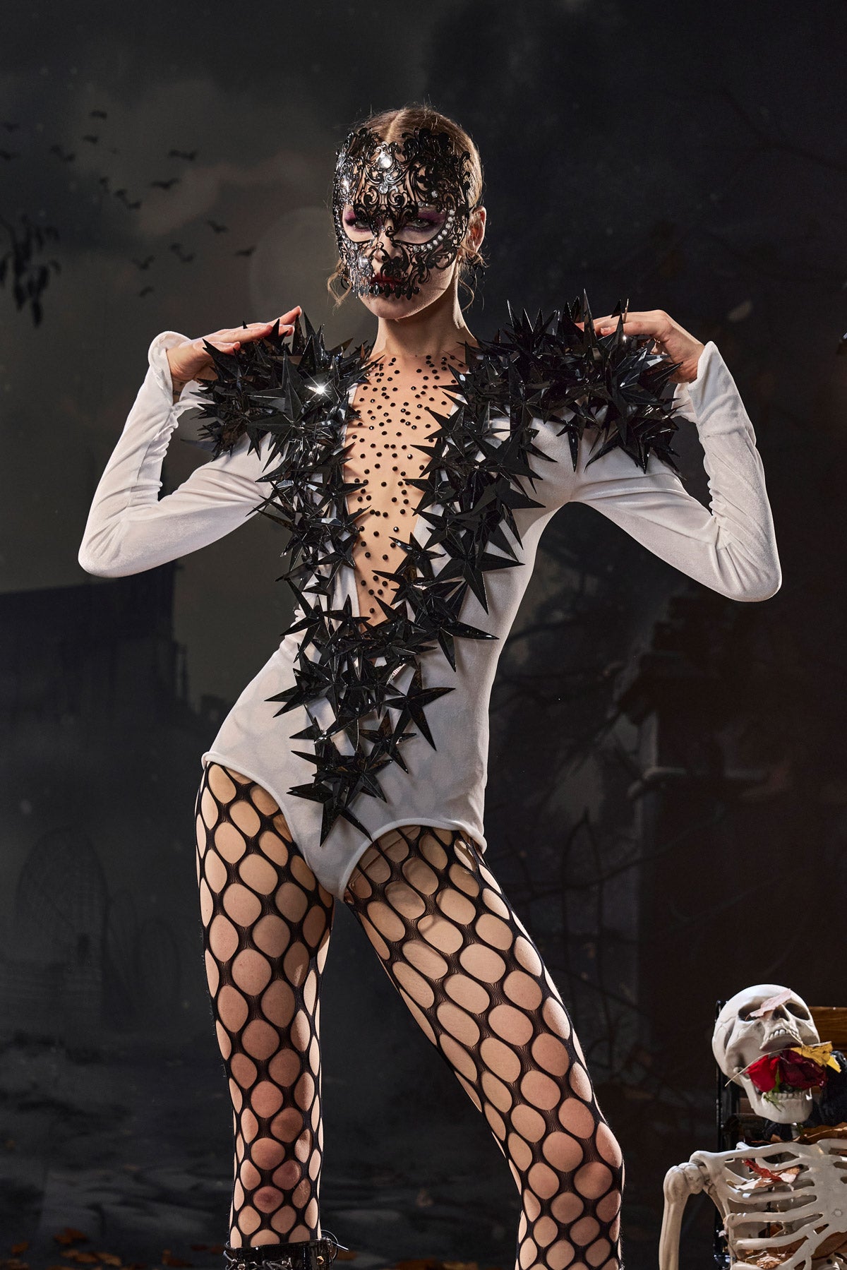This Steven Long Sleeve Star Sequin Bodysuit is perfect for parties and evenings. Its unique black star design combines with a deep mesh V-neckline. Long sleeves provide added coverage, while the bodysuit's sleek, flattering silhouette creates a bold and stylish look. Whether you're at a chic party, a nightclub, or a special occasion, this bodysuit will make you the center of attention and showcase your unique style.