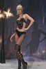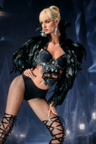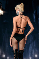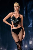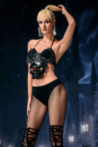 The Embla Lace Skeleton Top delivers a sharp, high-contrast stage silhouette shaped by its skeletal lace patterning, translucent structure, and precision-fitted outline that highlights the performer’s core form with striking clarity. The lace “skeleton” framework creates an intricate visual map across the upper body, combining open-space transparency with defined graphic lines that respond cleanly to lighting and movement. Its fitted shape maintains strong posture and clean contour definition, while the sheer sections allow light to pass through, producing layered dimension that shifts subtly with choreography.