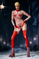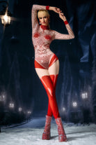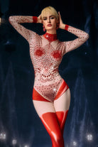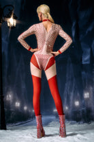 The Dagmar Long Sleeve Rhinestone Jumpsuit merges sleek contour design with full-body crystal radiance, delivering a streamlined performance look built for clarity, impact, and high-shine stage presence. This one-piece silhouette features long sleeves, a fitted torso, and precision-placed rhinestones that trace the body’s natural lines, amplifying every movement with luminous definition. The base fabric molds into a clean, uninterrupted shape, while the crystal mapping adds dimensional sparkle that reacts dynamically to lighting. The extended sleeve design reinforces the suit’s elegant vertical flow, guiding the eye from shoulder to hem for a taller, sharper visual profile.