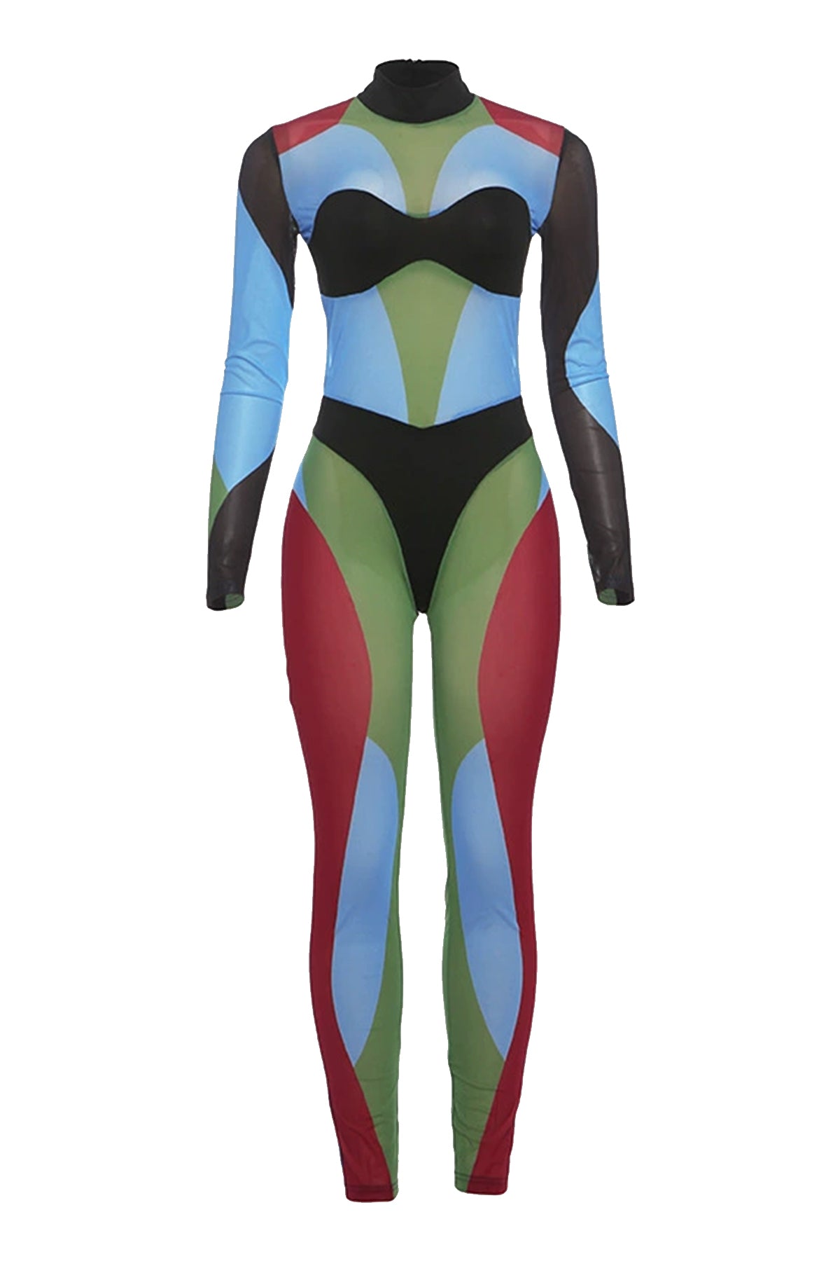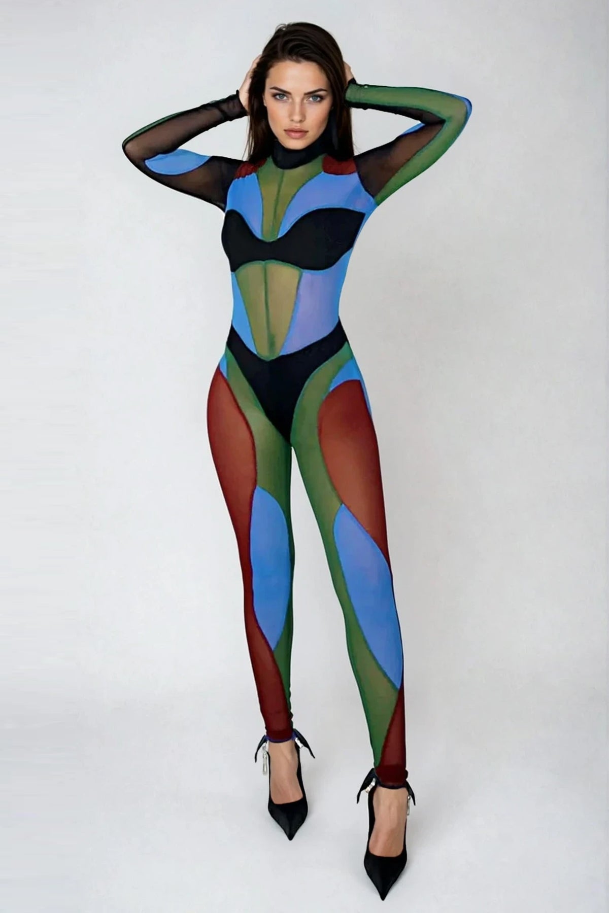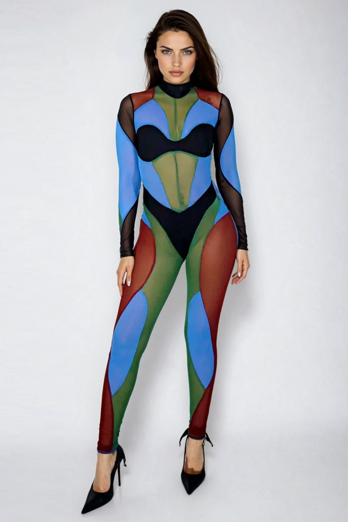 Dyrhildra Colorblock Long Sleeve Jumpsuit-Segmented Contrast, Dynamic Line Control