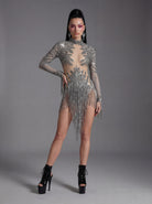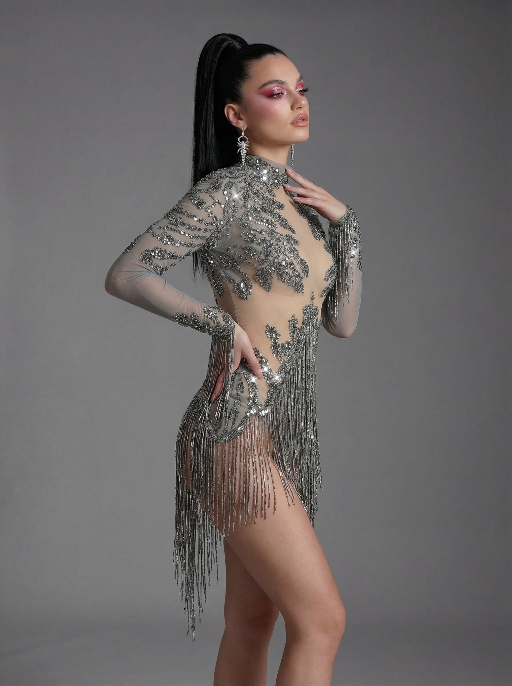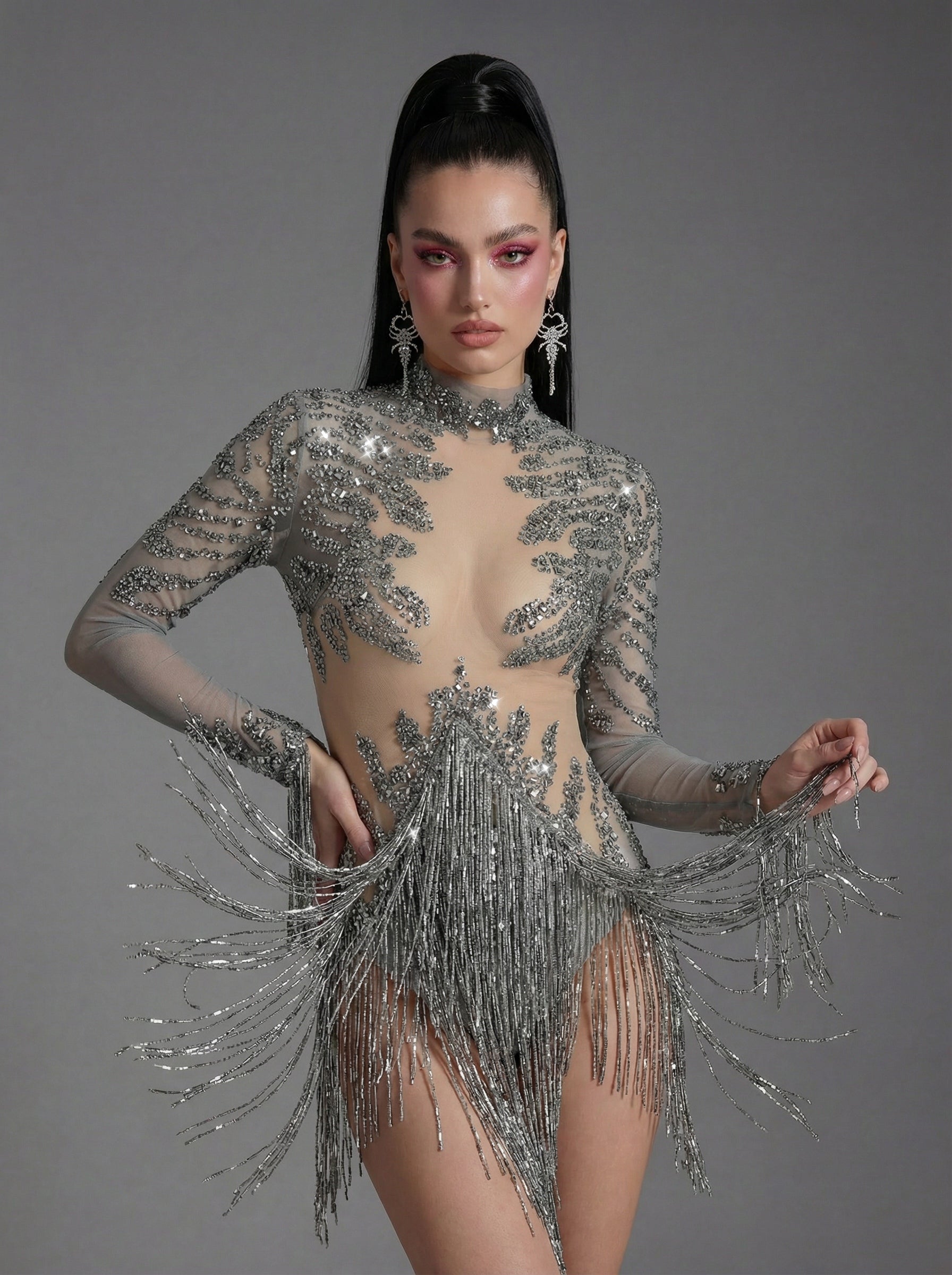 The Orvynia Long Sleeve Rhinestone Fringe Bodysuit delivers a high-impact stage silhouette through precision-set rhinestones, fluid fringe detailing, and a sculpted long-sleeve form designed for spotlight dominance. Rhinestone embellishments capture and refract light with sharp clarity, while cascading fringe amplifies movement, transforming steps, turns, and gestures into radiant visual rhythm. The fitted bodysuit construction creates a clean, continuous body line, and the long sleeves extend arm articulation for heightened expression and controlled performance presence under intense lighting.