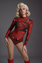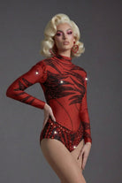 The Porslyn Long Sleeve Rhinestone Printed Bodysuit delivers a striking, stage-driven silhouette through its high-contrast printed surface, precision-set rhinestone accents, and sculpted long-sleeve construction designed for visual authority. The graphic print establishes bold surface rhythm, while rhinestones amplify light response with sharp sparkle that reads instantly under spotlight conditions. Long sleeves extend and define arm lines, enhancing expressive movement, and the fitted bodysuit form creates a clean, continuous body line that maintains clarity and control throughout performance.