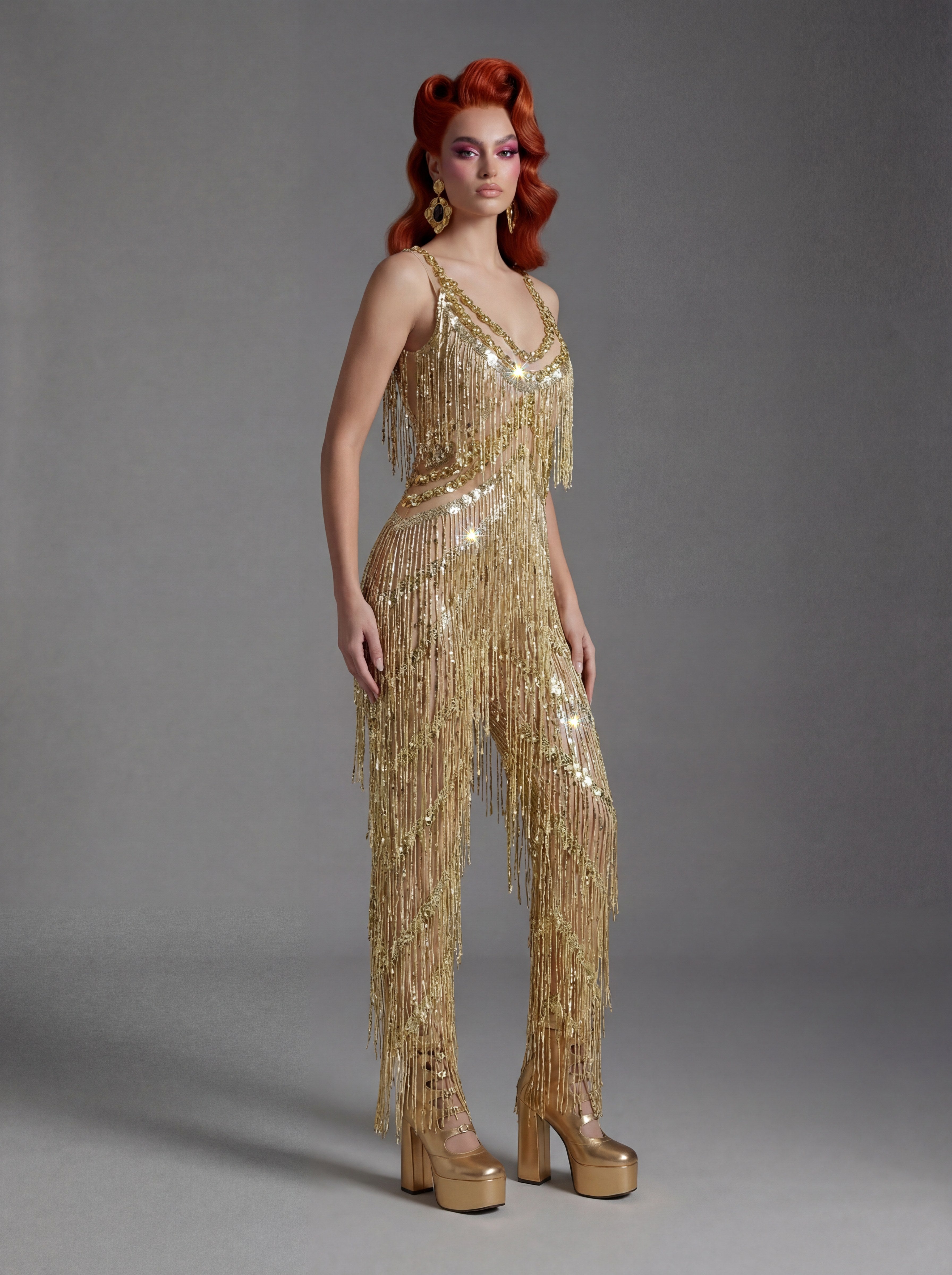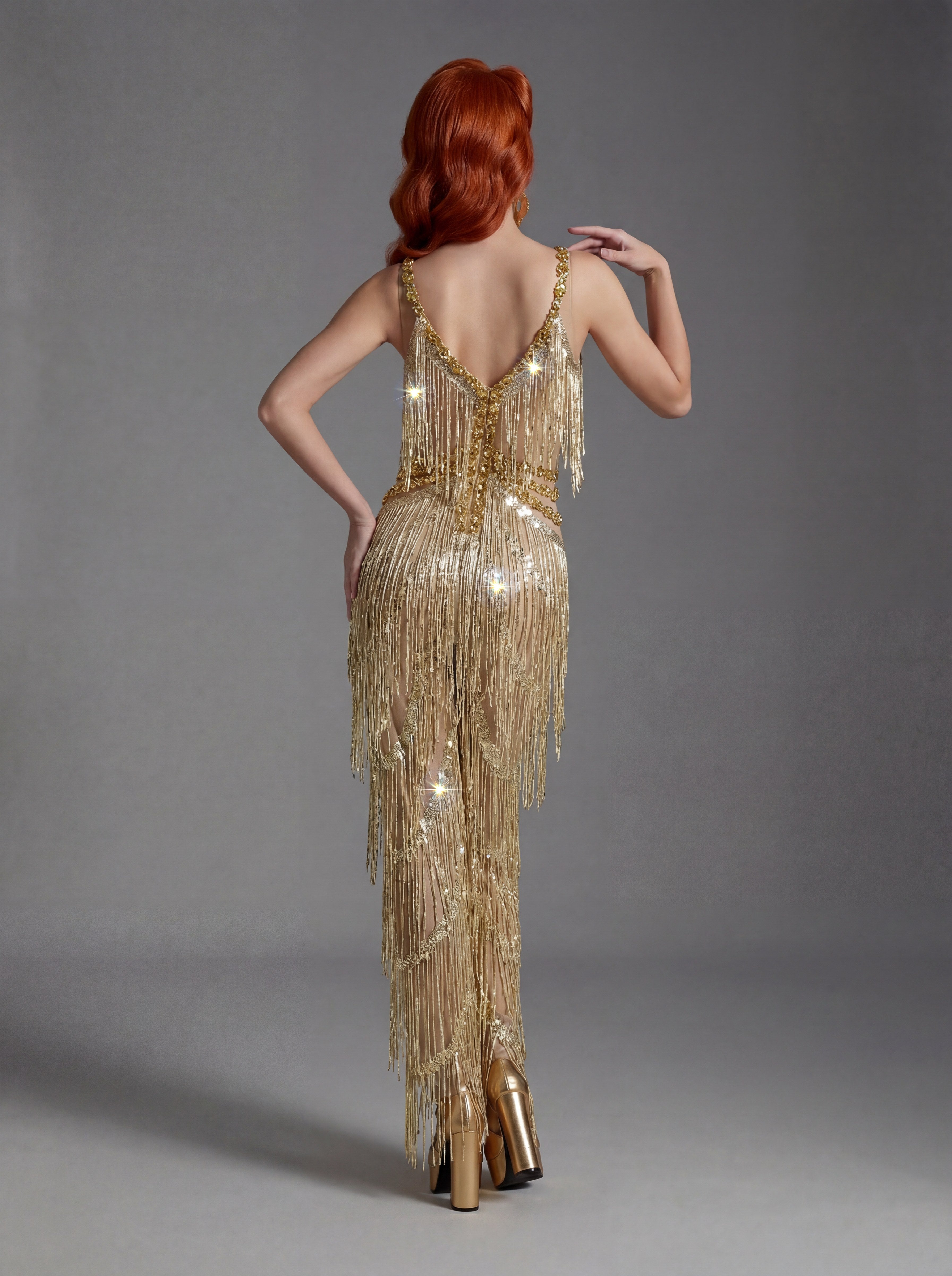 The Styrna Spaghetti Crystal Fringe Jumpsuit delivers a high-impact stage silhouette through its delicate spaghetti straps, cascading crystal fringe, and sculpted one-piece construction designed for luminous movement. The fine straps frame the shoulders and neckline with airy elegance, while crystal fringe captures and refracts light in motion, transforming every step, turn, and gesture into radiant visual rhythm. The fitted jumpsuit form extends the body into a clean vertical line, ensuring clarity, confidence, and commanding presence under spotlight conditions.