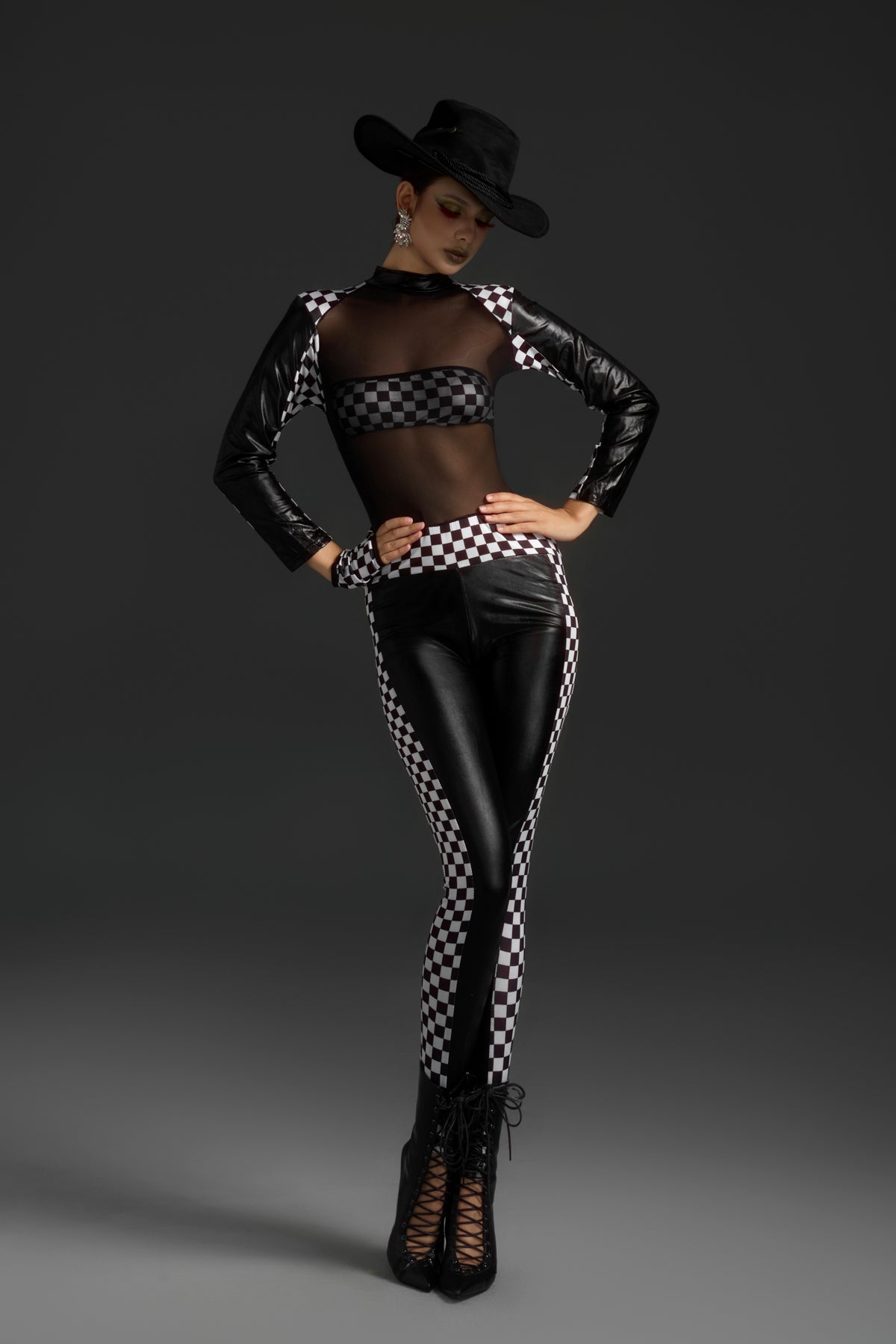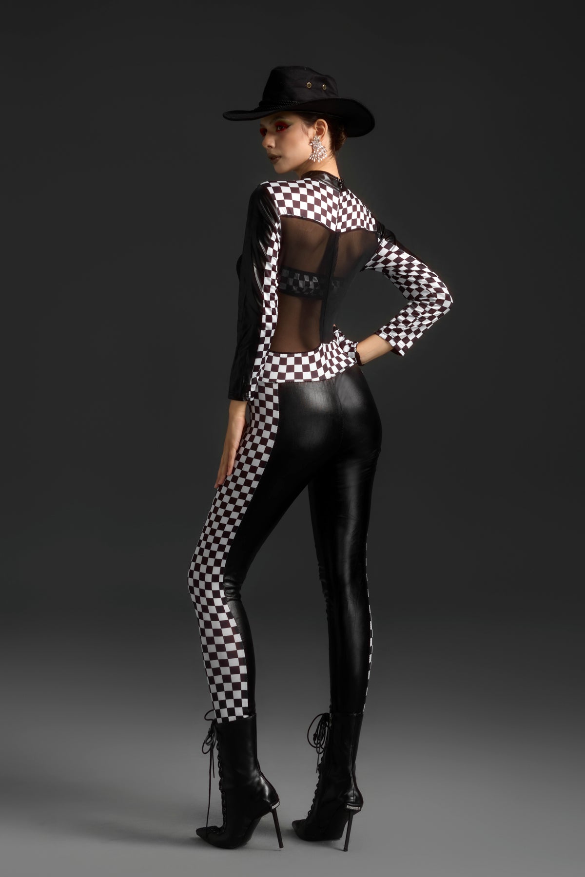 - Note: This jumpsuit includes a single glove and a strapless bra.