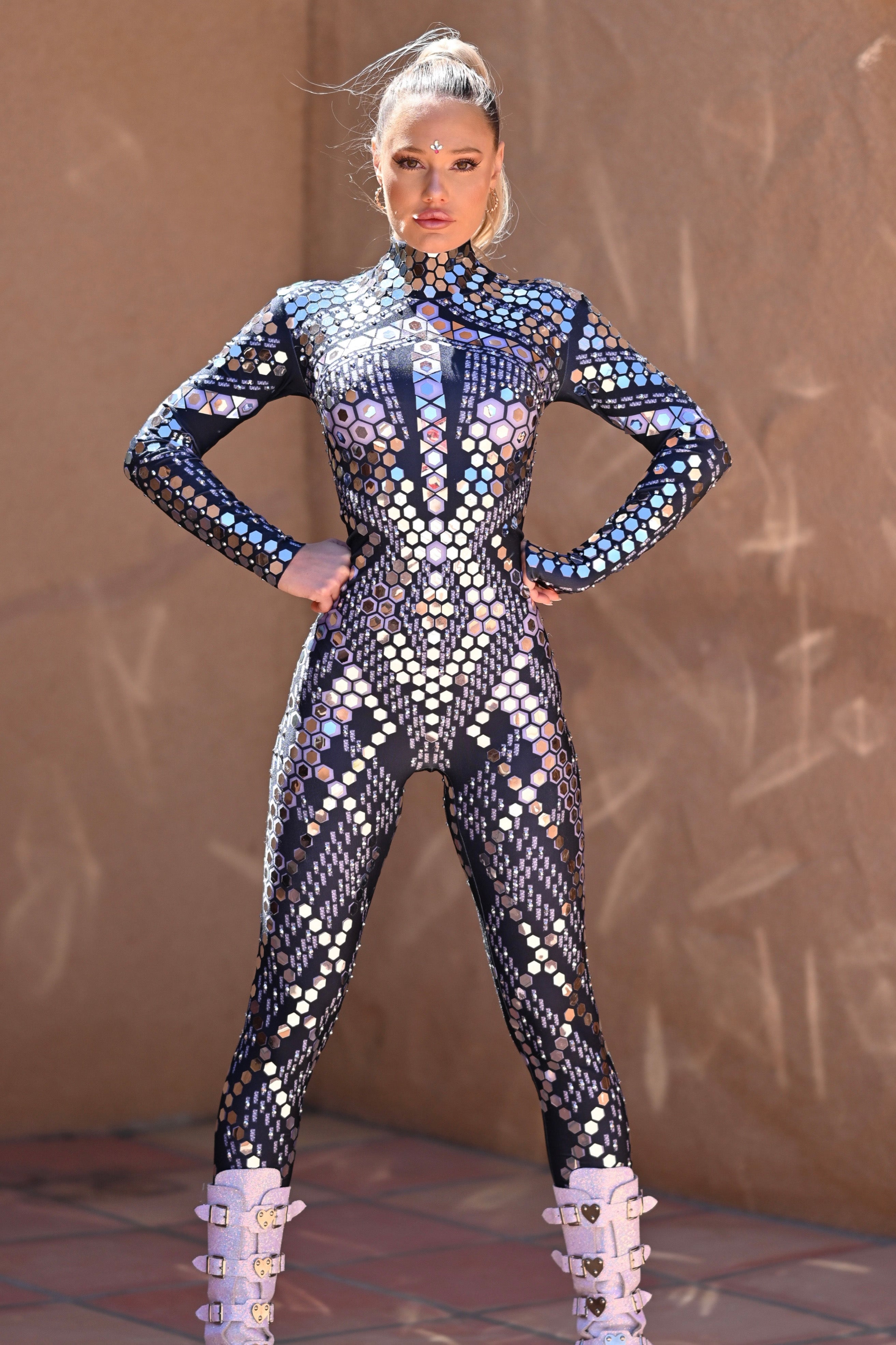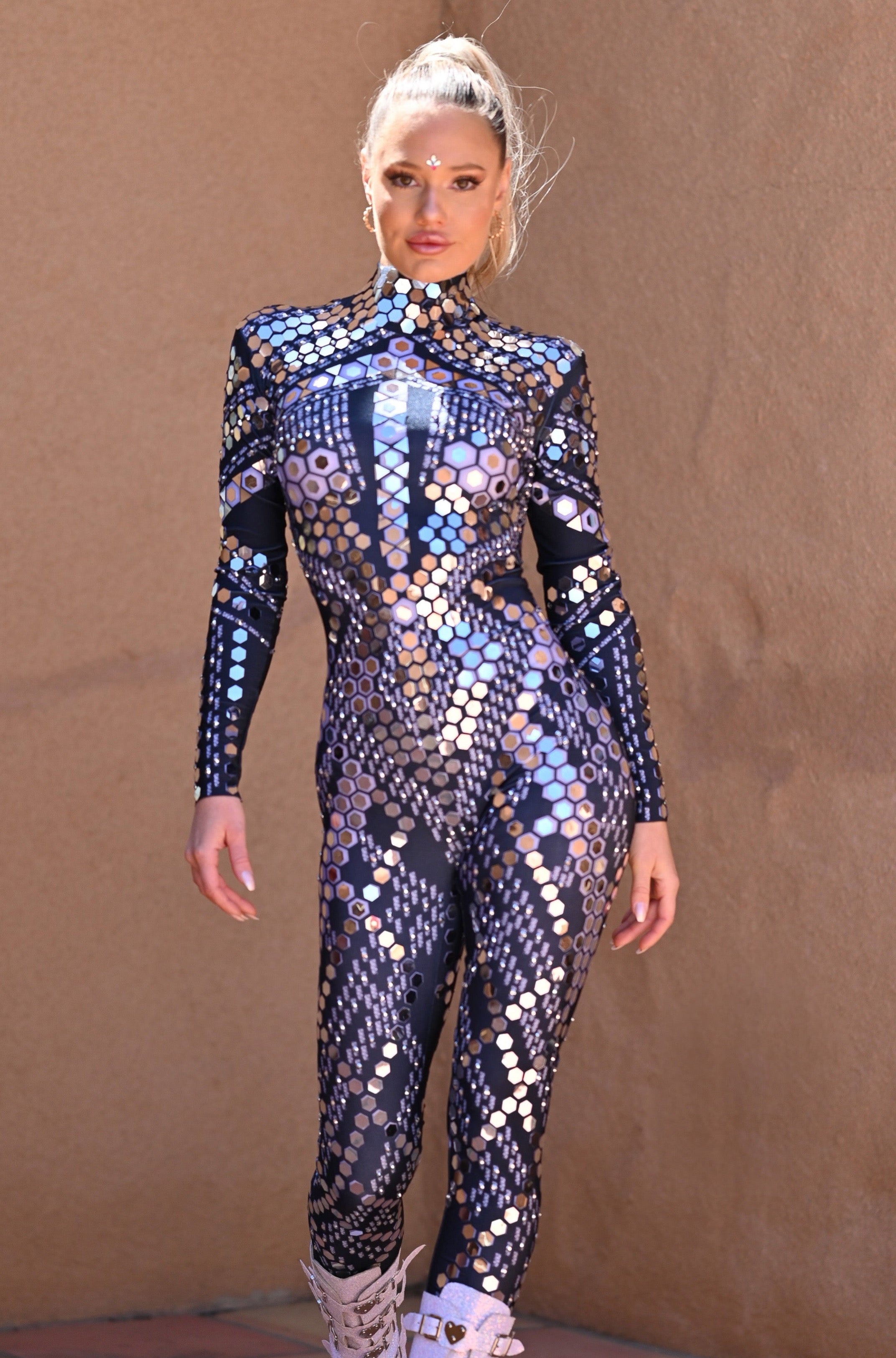 This Adriana Long Sleeve Mirror Jumpsuit Black, combining European and American avant-garde and elegant styles. It is a high-end performance costume designed for women who pursue unique personality and stage charm. Carefully hand-pasted silver rhinestones and mirror create a charming mirror effect, making you the focus in any occasion.