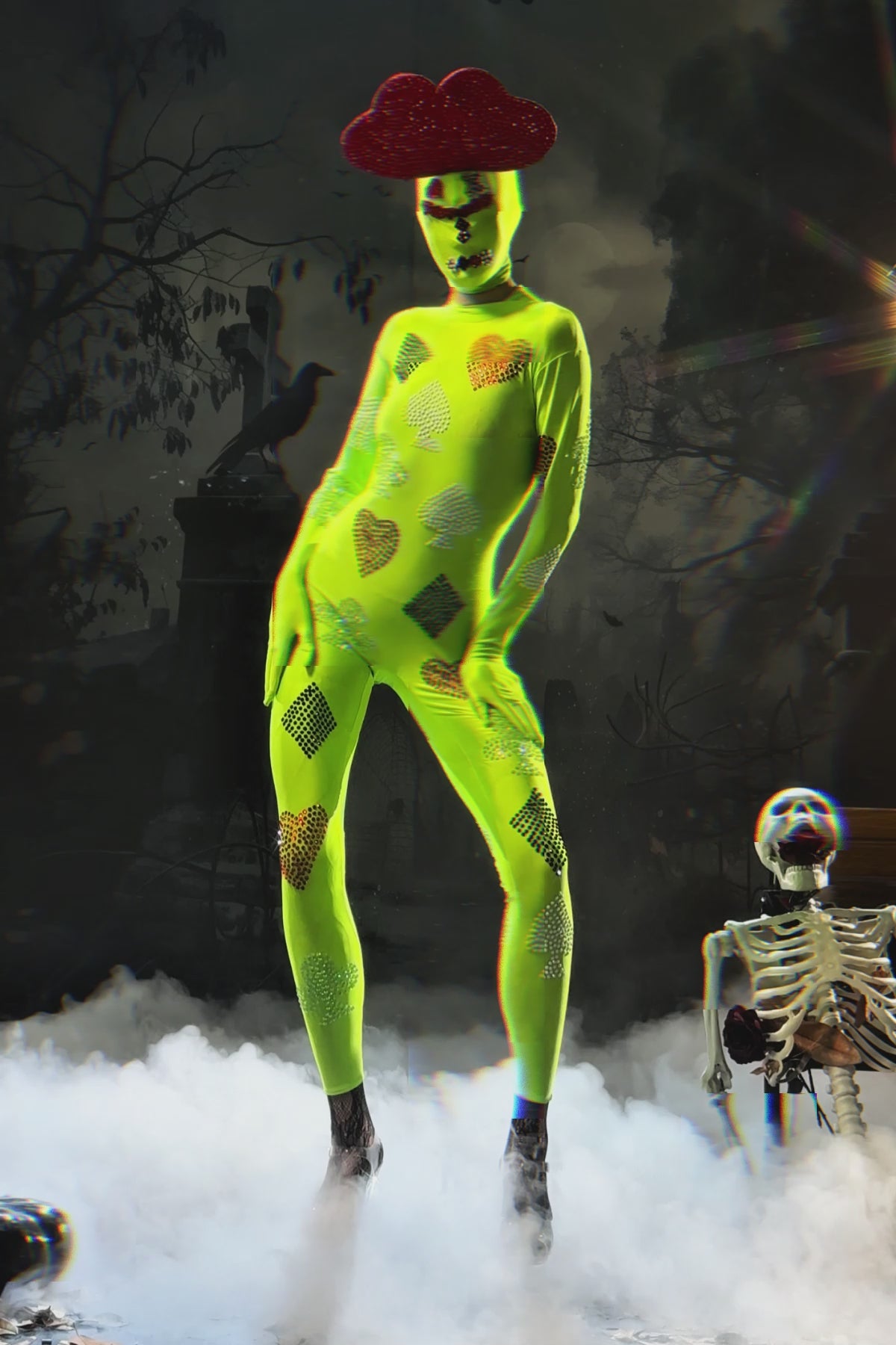 Show off your bold performance energy in this Aidan Poker Gloves Jumpsuit with Headgear. This bright green jumpsuit brings casino-style glamour to the stage. The jumpsuit features integrated long sleeves with glove extensions for a seamless silhouette while adding functionality for action-packed performances. A matching headpiece enhances the dramatic effect, creating a unified, eye-catching look perfect for dancers, performers, or themed nights. The bold color and striking design make this outfit a real head-turner.