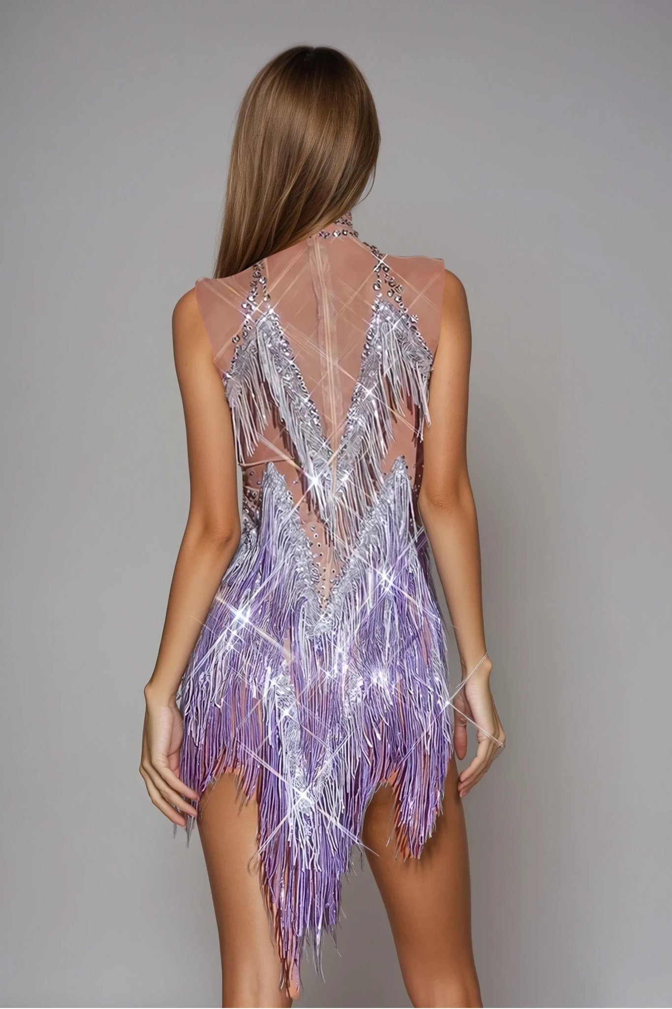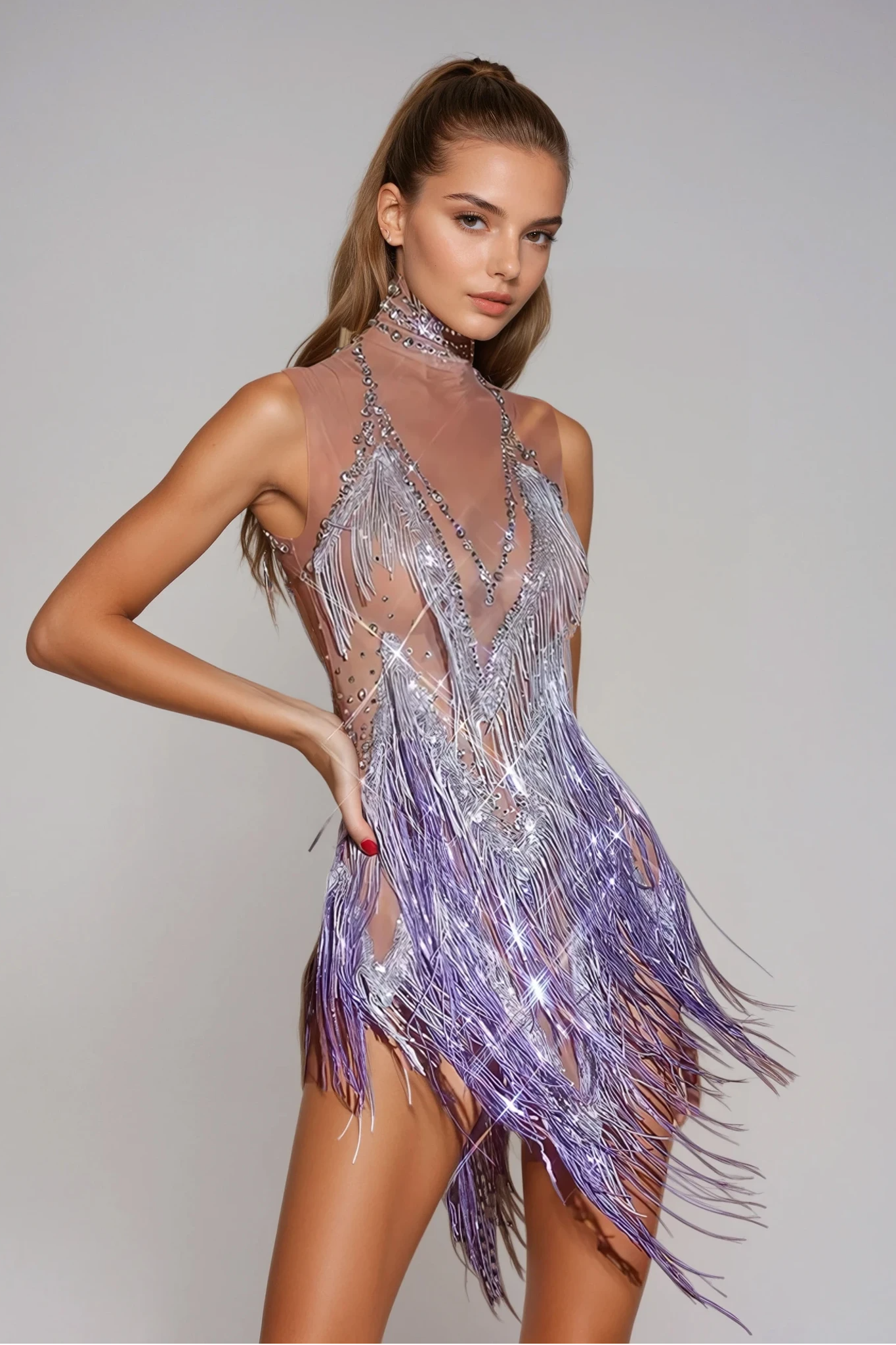 Make an unforgettable appearance in our Alaiya Fringe Mesh Bodysuit Purple, the perfect blend of sexy, sparkly and stage-ready. This eye-catching bodysuit features a see-through mesh construction that hugs your curves and shows just the right amount of skin. Covered in glittering rhinestones and embellished with playful fringe, the bodysuit flows and sways with every step, twirl or beat. Whether you're performing, hosting or just being the center of attention, this bodysuit will make you the center of attention.