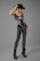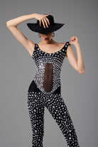 The Christian Mesh Crystal Embellished Jumpsuit radiates sophistication through structure and shimmer. Crafted from sheer black mesh and adorned with precision-set crystals, it sculpts the body with fluid brilliance. The fitted silhouette enhances natural curves while maintaining a sleek, performance-ready edge. Designed for stage, show, or statement styling, this jumpsuit captures the perfect balance of glamour and strength.