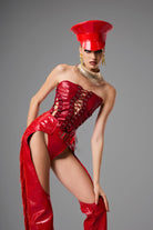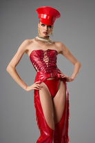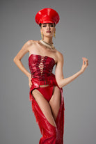 The Shawn Strapless Lace Up Top in Red channels confidence through its sleek design and fiery tone. Crafted with a structured silhouette and lace-up front detailing, it sculpts the body with precision while adding a touch of daring allure. The strapless cut enhances the neckline, creating a perfect balance of strength and sensuality. Ideal for stage looks, night events, or bold street styling, this top exudes power and poise.