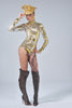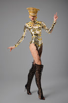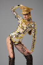 Thomas Long Sleeve Embellished Mirror Bodysuit-Shimmering Rhinestones with a Glamorous Gold Finish