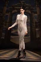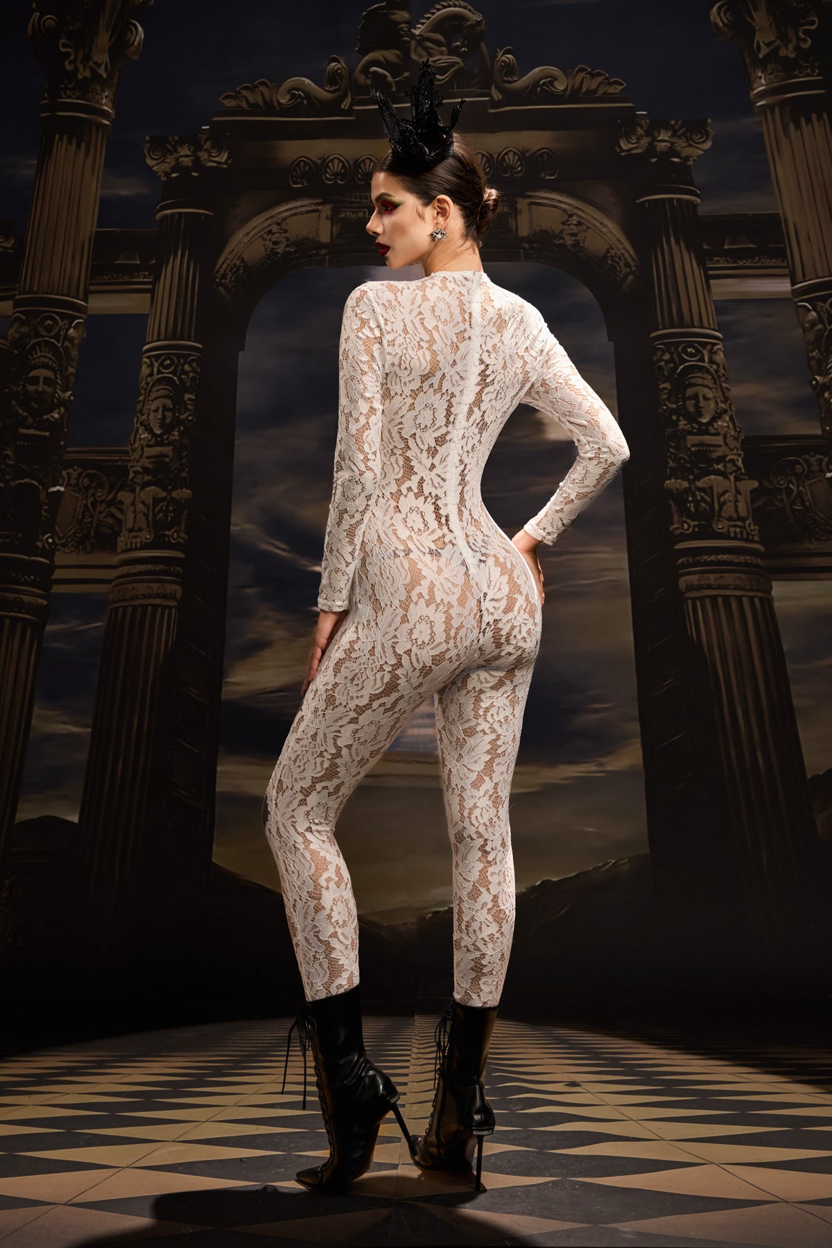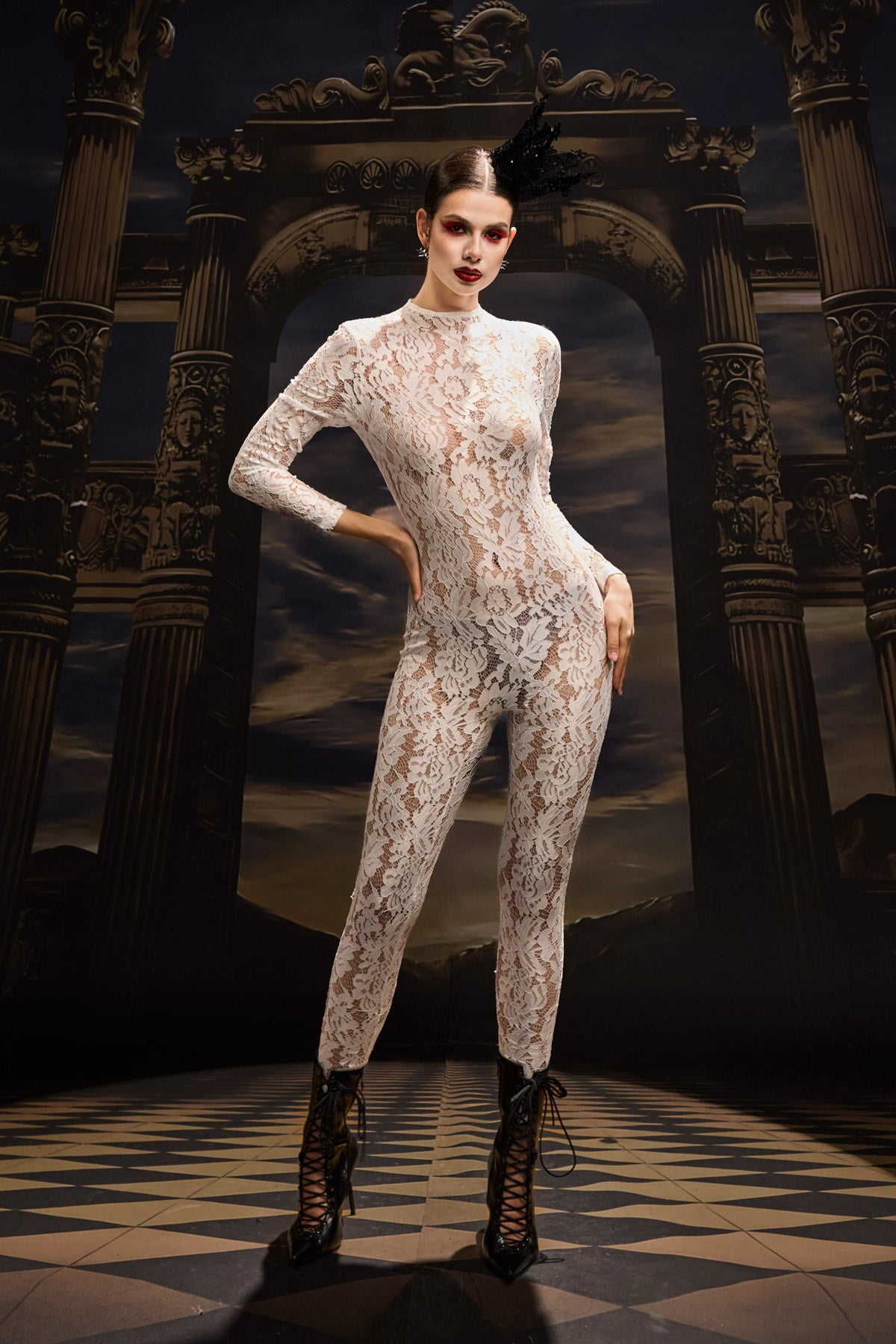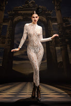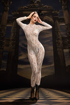 The Tuuli Lace Long Sleeve Jumpsuit embodies timeless sophistication with a modern, sculpted edge. Crafted from delicate floral lace, this full-length design offers an alluring balance of coverage and allure. The intricate lace pattern highlights the body’s natural lines, while the long sleeves and tailored silhouette add refinement and poise. Perfect for performances, high-fashion showcases, or elegant evening moments, this jumpsuit radiates purity, confidence, and effortless luxury.