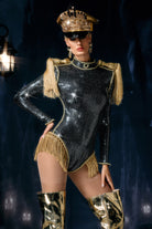 The Tyrka Long Sleeve Fringe Bodysuit With Crown blends sculpted stage elegance with a bold, regal attitude, pairing a fitted long-sleeve silhouette with fluid fringe that moves in bright, rhythmic waves under performance lighting. The bodysuit’s clean lines create strong visual structure, while the cascading fringe adds dynamic texture and motion that enhances every turn, pose, or step. The matching crown elevates the look with a commanding, character-driven finish, bringing a sense of authority and theatrical presence. Designed for high-impact shows, dramatic entrances, and spotlight-driven styling, Tyrka combines shine, movement, and power into one unforgettable performance piece.